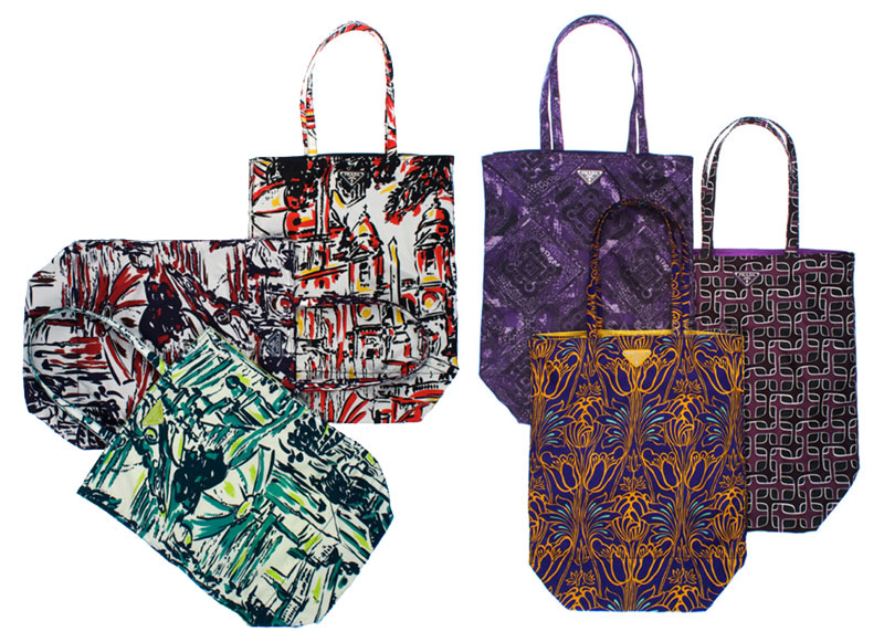 A collection of lightweight bags (5 ounces) in the traditional Prada fabric embelished with select archive prints. “B.Y.O Bags” to carry at all times.