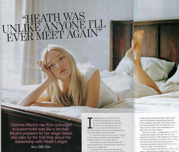 But she’s back and obviously matured, talking with Sunday Magazine (found inside the Sunday newspapers published by Rupert Murdoch’s News Limited in Australia) about how she met and came to date Heath Ledger and her upcoming role in a play called The Ugly One. Check out the article that went to print here and here (it’s somehow been spilt in two for the web).