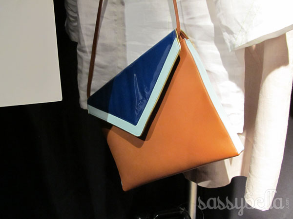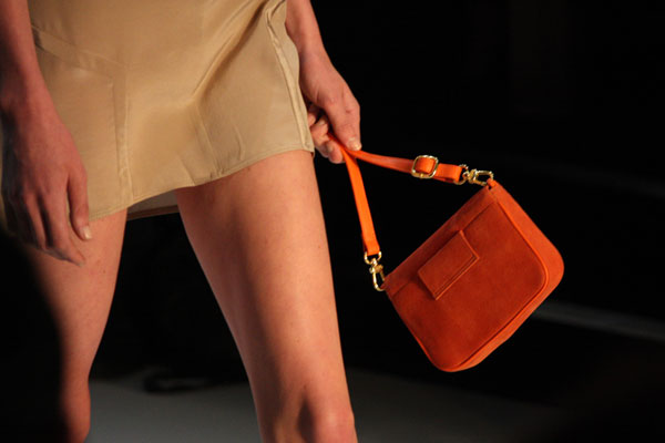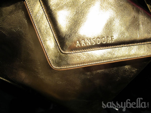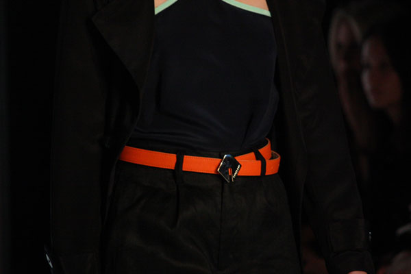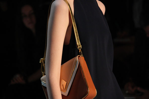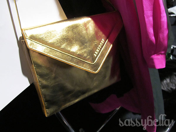 Our favourite part of the Arsndorf Spring/Summer 2011-12 collection was the addition of accessories this season, with the addition of belts, shoes and bags providing the perfect accent. We loved the envelope clutch bags in metallic gold, rusty brown suede and a trio of patent blue, brown and white and the addition of footwear – gold ballet flats and an array of blue gold and tan heels. It was a show about the details for us, with blazers accented with silver metal accents on the collar and belts with diamond shaped buckles and the Arnsdorf logo tooled into it.