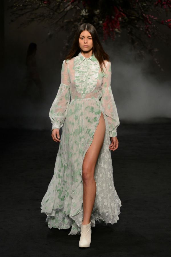 Designers Adrian Norris and Edwina Robinson paired soft cottons and linens with delicate beads and large metallic sequins that lent the looks an erethral, underwater feel. For the ultra-femme, floor-skimming gowns, Norris and Robinson used pastel green and candy pink hues to create an effortlessly chic look. Thigh-high splits and full button-up shirt detailing provided a sharp juxtaposition of ladylike and subtle sensuality, all within the same look.