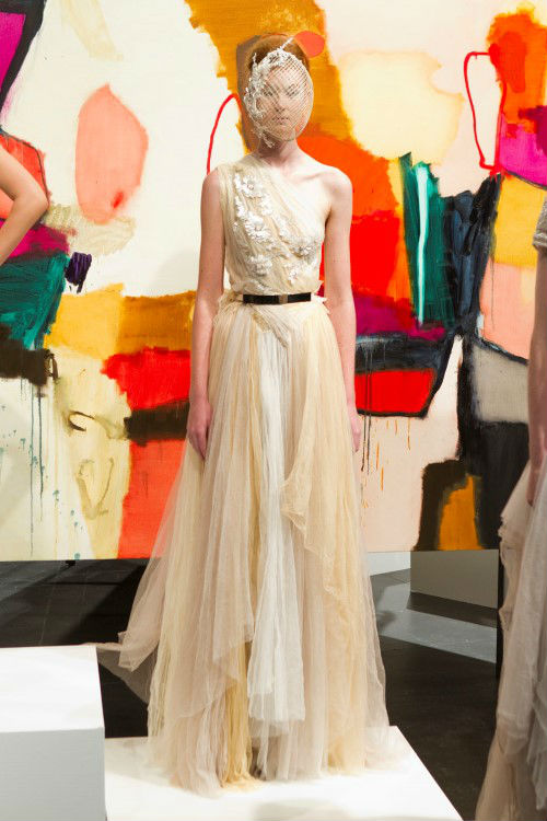 As always, Costarella played with luxe silks and tulles and incorporated drapings, metallics and sequins to his designs. Adding to the impact of the ethereal looks was a liver performance by Grace Woodroofe and a backdrop of artworks by Waldemar Kolbusz, both of whom Costarella look to the work of for inspiration.